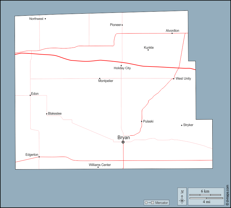 d-maps > संयुक्त राज्य > ओहायो > विलियम्स काउंटी > बाह्यरेखा, मुख्य शहरों, सड़कों, नाम