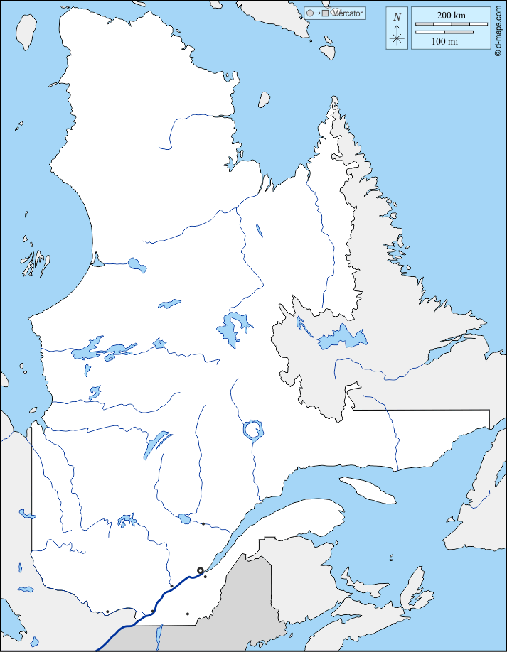 d-maps > महाअमेरिका > कनाडा > क्यूबेक > सीमाओं, जल-सर्वेक्षण, मुख्य शहरों