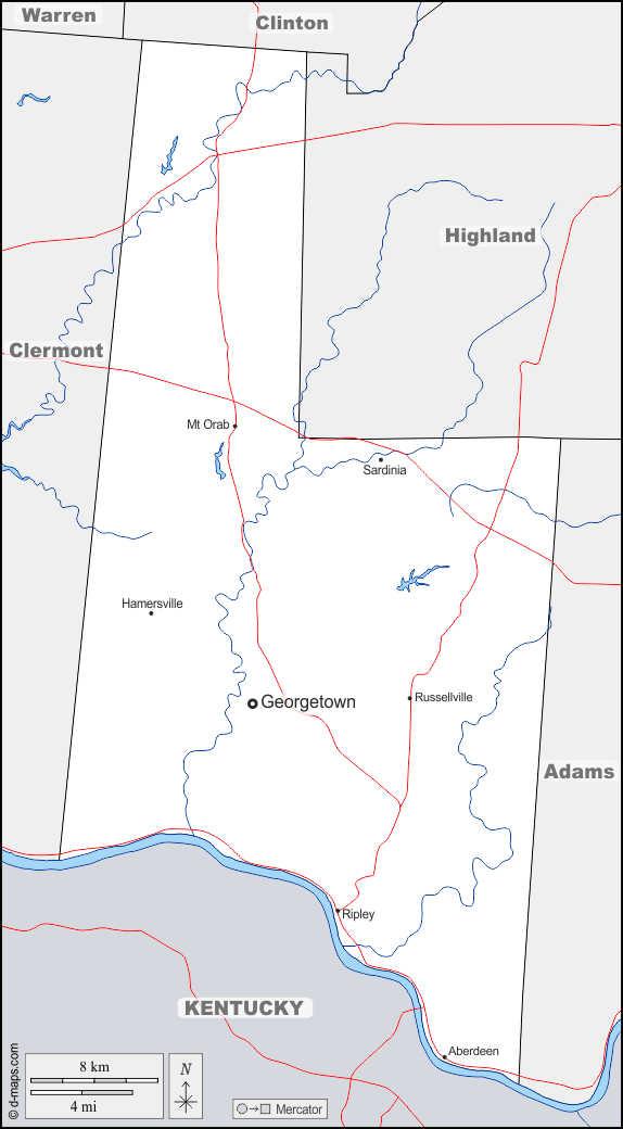 d-maps > संयुक्त राज्य > ओहायो > ब्राउन काउंटी > सीमाओं, जल-सर्वेक्षण, मुख्य शहरों, सड़कों, नाम