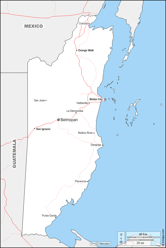 d-maps > महाअमेरिका > बेलीज़ > सीमाओं, मुख्य शहरों, सड़कों, नाम