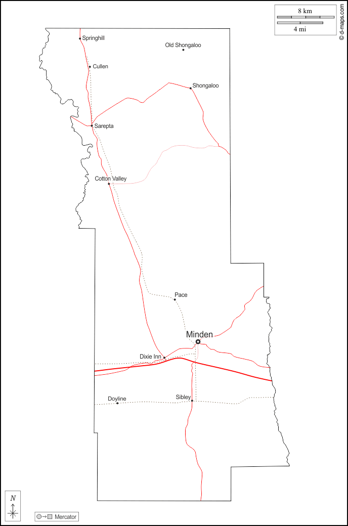 d-maps > संयुक्त राज्य > लुइसियाना > वेबस्टर पैरिश > बाह्यरेखा, मुख्य शहरों, सड़कों, नाम, सफेद
