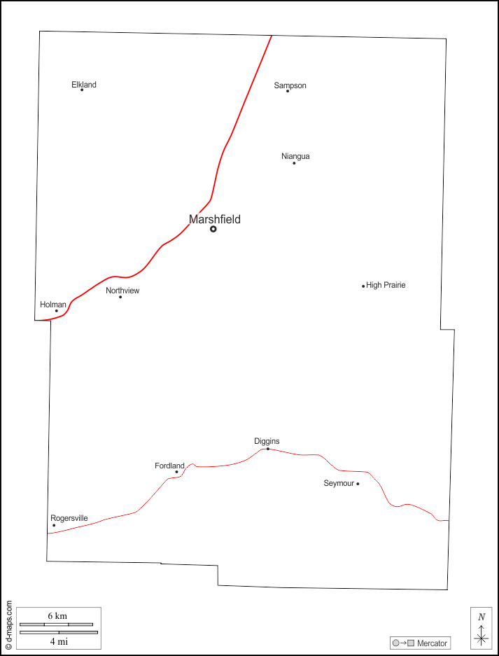 d-maps > संयुक्त राज्य > मिज़ूरी > वेबस्टर काउंटी > बाह्यरेखा, मुख्य शहरों, सड़कों, नाम, सफेद