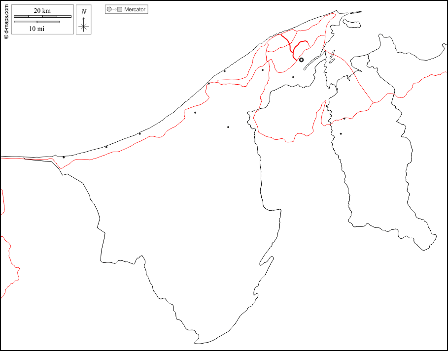 d-maps > एशिया > ब्रुनेई > सीमाओं, मुख्य शहरों, सड़कों, सफेद
