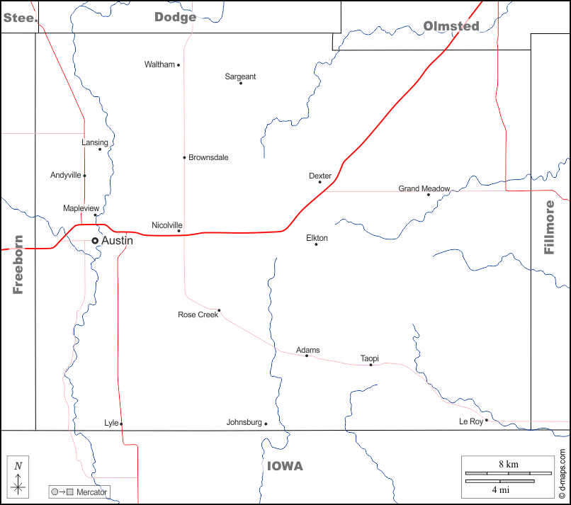 d-maps > संयुक्त राज्य > मिनेसोटा > मोवर काउंटी > सीमाओं, जल-सर्वेक्षण, मुख्य शहरों, सड़कों, नाम, सफेद