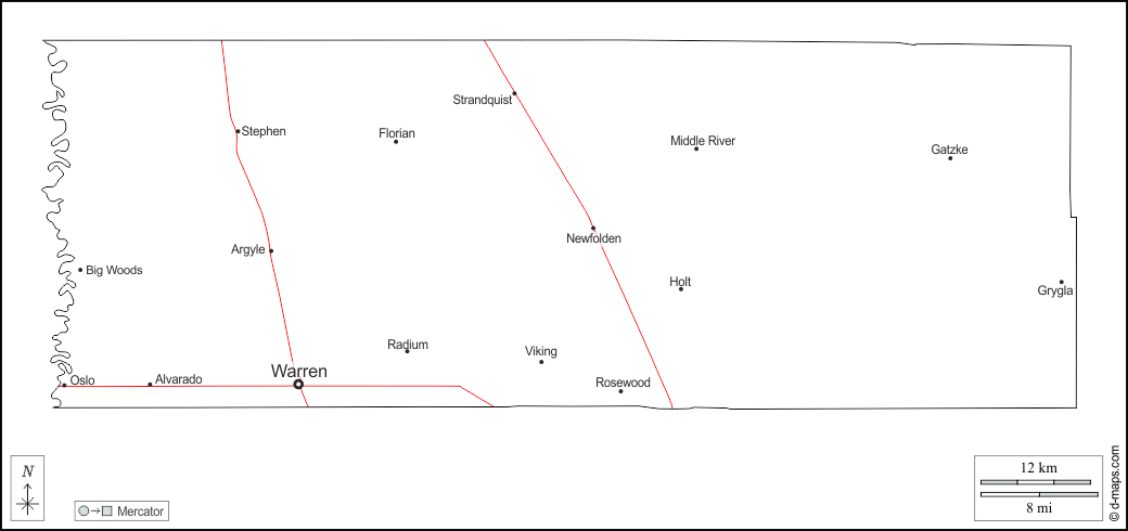 d-maps > संयुक्त राज्य > मिनेसोटा > मार्शल काउंटी > बाह्यरेखा, मुख्य शहरों, सड़कों, नाम, सफेद