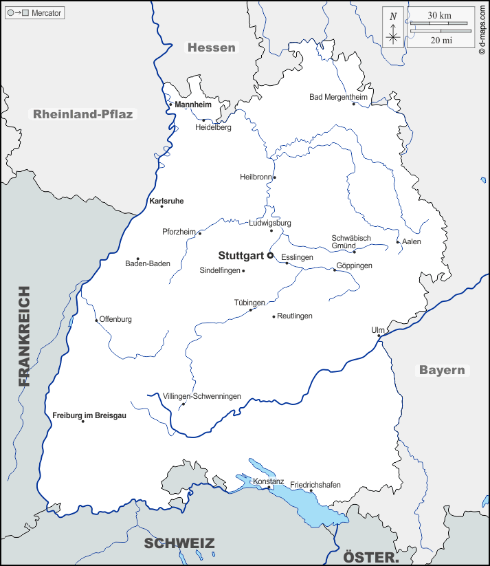 d-maps > यूरोप > जर्मनी > बाडेन-वुर्टेमबर्ग राज्य > सीमाओं, जल-सर्वेक्षण, मुख्य शहरों, नाम
