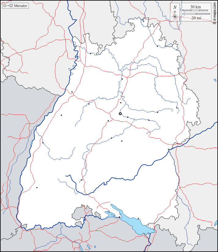 d-maps > यूरोप > जर्मनी > बाडेन-वुर्टेमबर्ग राज्य > सीमाओं, जल-सर्वेक्षण, मुख्य शहरों, सड़कों