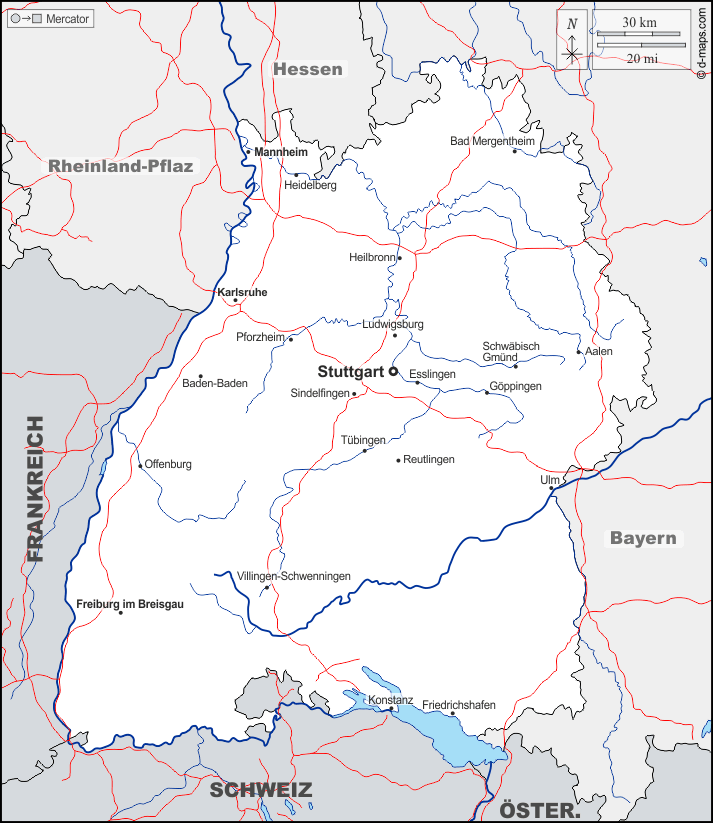 d-maps > यूरोप > जर्मनी > बाडेन-वुर्टेमबर्ग राज्य > सीमाओं, जल-सर्वेक्षण, मुख्य शहरों, सड़कों, नाम
