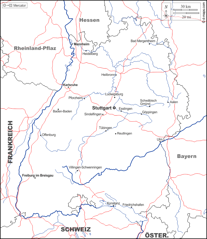 d-maps > यूरोप > जर्मनी > बाडेन-वुर्टेमबर्ग राज्य > सीमाओं, जल-सर्वेक्षण, मुख्य शहरों, सड़कों, नाम, सफेद