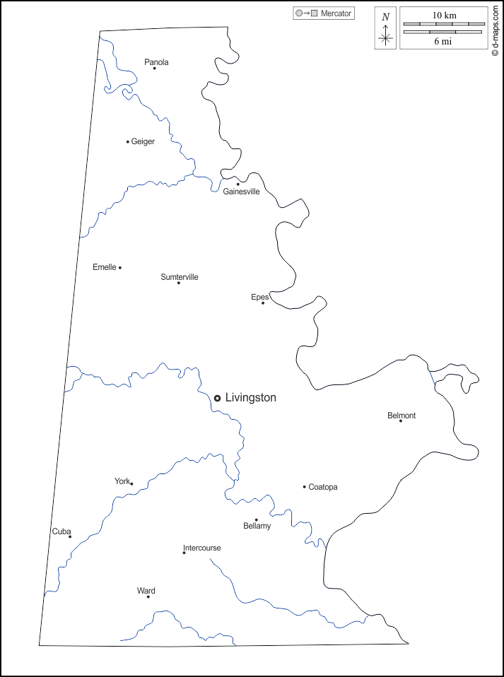 d-maps > संयुक्त राज्य > अलबामा > सुम्टर काउंटी > बाह्यरेखा, जल-सर्वेक्षण, मुख्य शहरों, नाम, सफेद