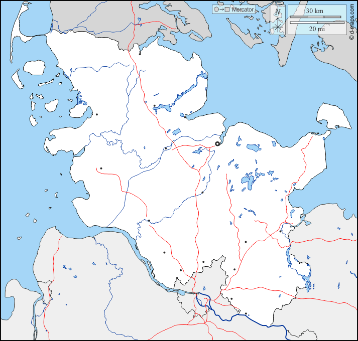 d-maps > यूरोप > जर्मनी > श्लेस्विग-होल्स्टीन राज्य > सीमाओं, जल-सर्वेक्षण, मुख्य शहरों, सड़कों