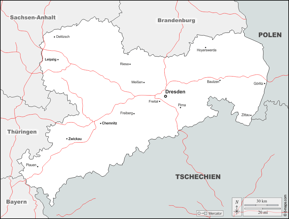 d-maps > यूरोप > जर्मनी > सैक्सोनी का स्वतंत्र राज्य > सीमाओं, मुख्य शहरों, सड़कों, नाम