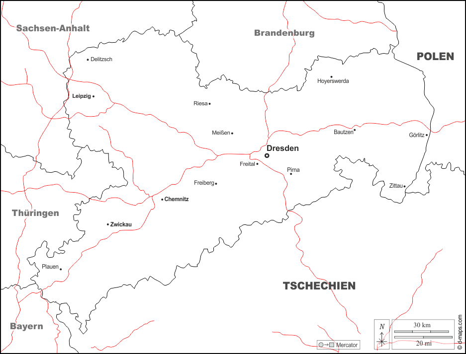 d-maps > यूरोप > जर्मनी > सैक्सोनी का स्वतंत्र राज्य > सीमाओं, मुख्य शहरों, सड़कों, नाम, सफेद