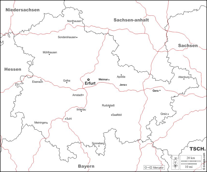 d-maps > यूरोप > जर्मनी > थुरिंगिया का स्वतंत्र राज्य > सीमाओं, मुख्य शहरों, सड़कों, नाम, सफेद