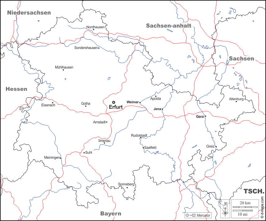 d-maps > यूरोप > जर्मनी > थुरिंगिया का स्वतंत्र राज्य > सीमाओं, जल-सर्वेक्षण, मुख्य शहरों, सड़कों, नाम, सफेद