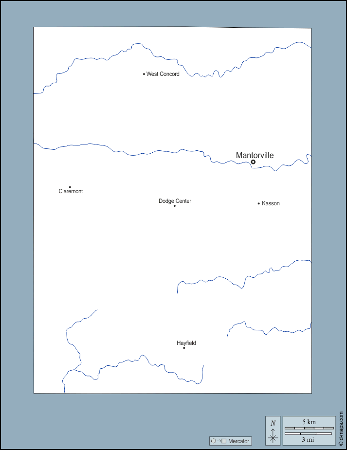 d-maps > संयुक्त राज्य > मिनेसोटा > डॉज काउंटी > बाह्यरेखा, जल-सर्वेक्षण, मुख्य शहरों, नाम