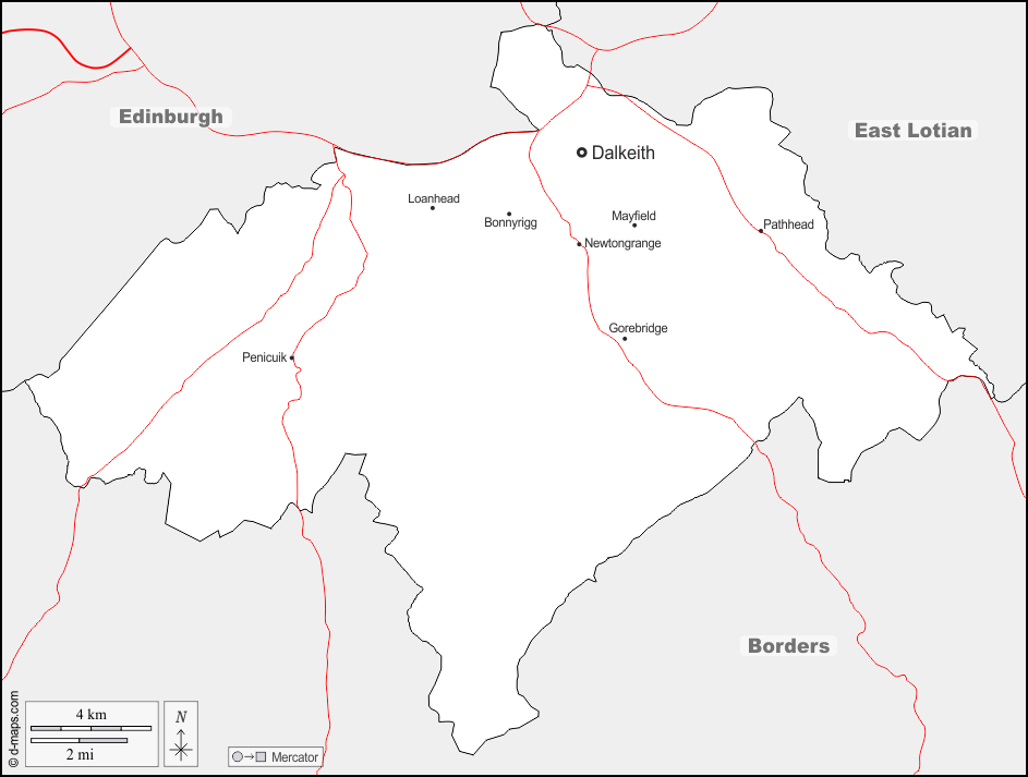 d-maps > यूरोप > युनाइटेड किंगडम > मिडलोथियन > सीमाओं, मुख्य शहरों, सड़कों, नाम