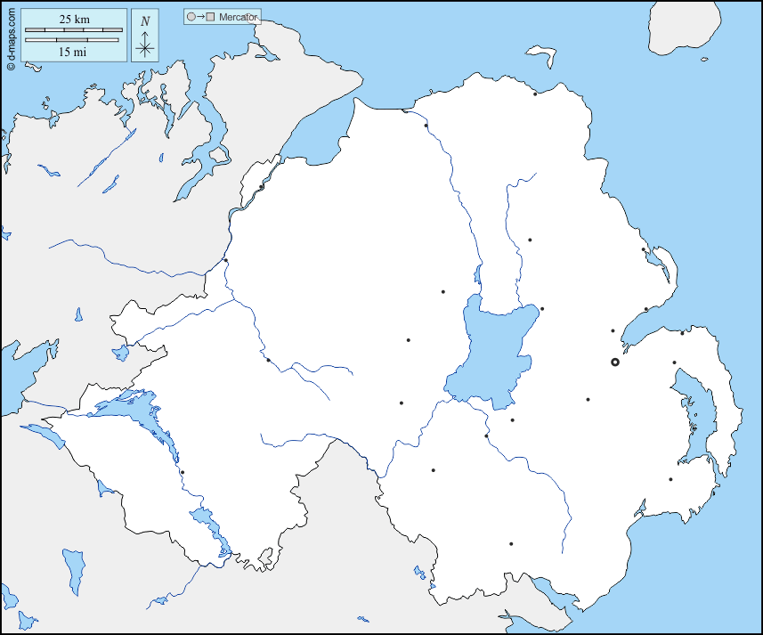 d-maps > यूरोप > युनाइटेड किंगडम > उत्तरी आयरलैंड > सीमाओं, जल-सर्वेक्षण, मुख्य शहरों