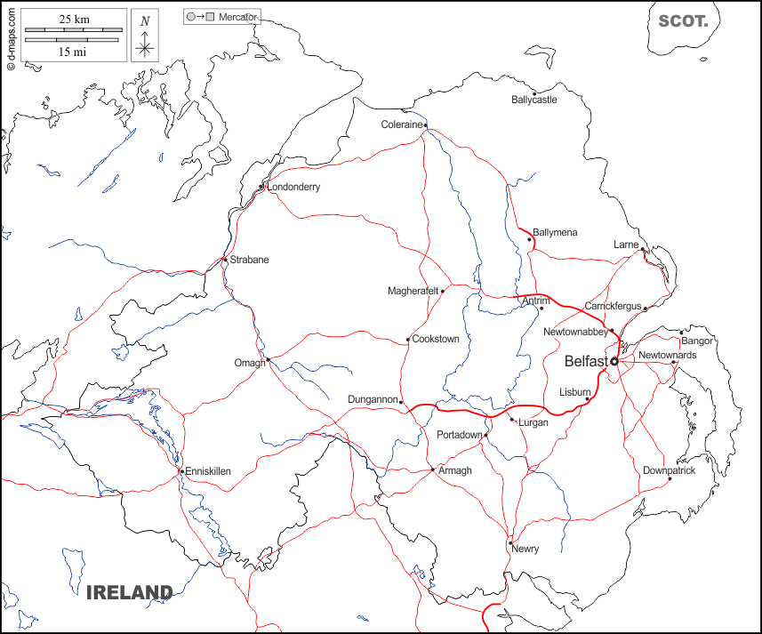 d-maps > यूरोप > युनाइटेड किंगडम > उत्तरी आयरलैंड > सीमाओं, जल-सर्वेक्षण, मुख्य शहरों, सड़कों, नाम, सफेद