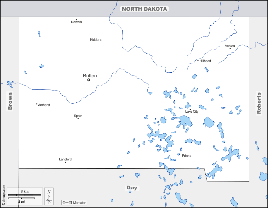 d-maps > संयुक्त राज्य > साउथ डकोटा > मार्शल काउंटी > सीमाओं, जल-सर्वेक्षण, मुख्य शहरों, नाम