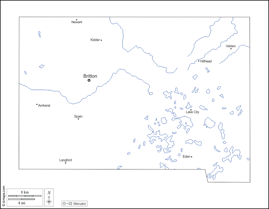 d-maps > संयुक्त राज्य > साउथ डकोटा > मार्शल काउंटी > बाह्यरेखा, जल-सर्वेक्षण, मुख्य शहरों, नाम, सफेद