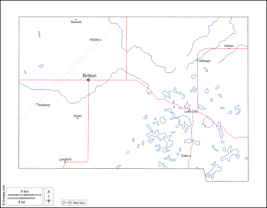 d-maps > संयुक्त राज्य > साउथ डकोटा > मार्शल काउंटी > बाह्यरेखा, जल-सर्वेक्षण, मुख्य शहरों, सड़कों, नाम, सफेद