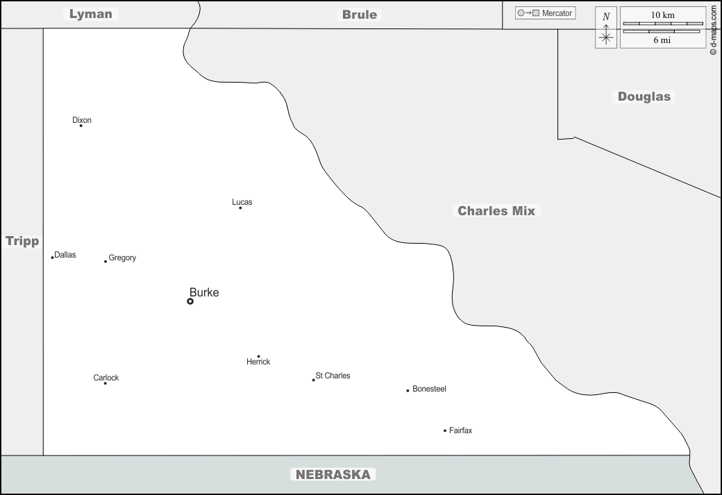 d-maps > संयुक्त राज्य > साउथ डकोटा > ग्रेगरी काउंटी > सीमाओं, मुख्य शहरों, नाम