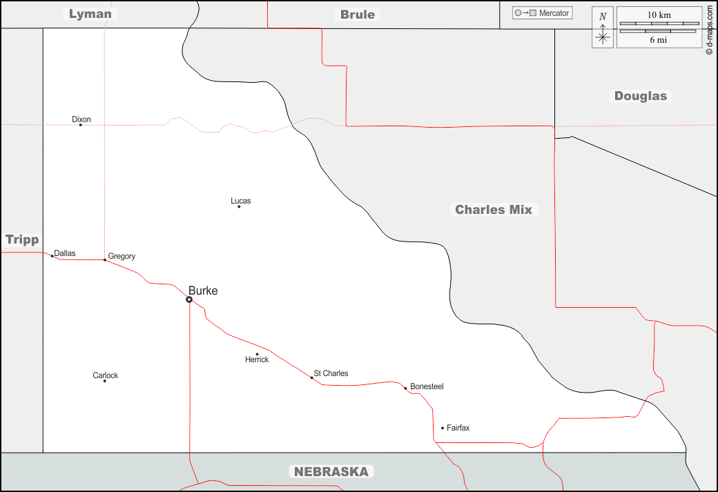 d-maps > संयुक्त राज्य > साउथ डकोटा > ग्रेगरी काउंटी > सीमाओं, मुख्य शहरों, सड़कों, नाम