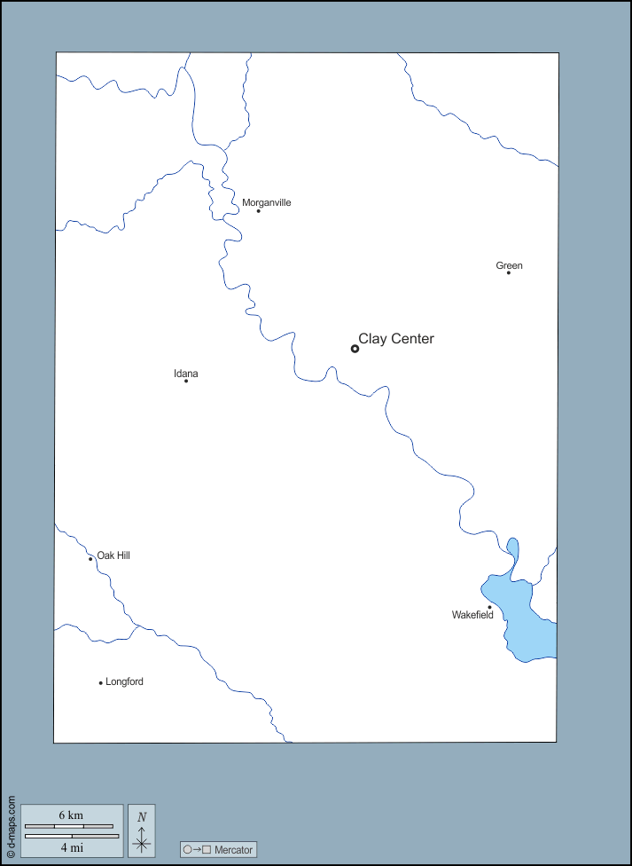 d-maps > संयुक्त राज्य > कैनसस > क्ले काउंटी > बाह्यरेखा, जल-सर्वेक्षण, मुख्य शहरों, नाम