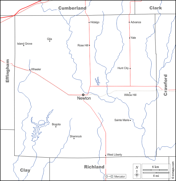 d-maps > संयुक्त राज्य > इलिनॉय > जैस्पर काउंटी > सीमाओं, जल-सर्वेक्षण, मुख्य शहरों, सड़कों, नाम, सफेद