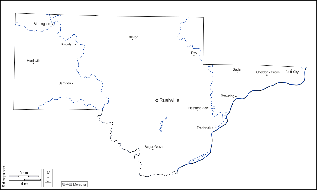 d-maps > संयुक्त राज्य > इलिनॉय > स्कूयलर काउंटी > बाह्यरेखा, जल-सर्वेक्षण, मुख्य शहरों, नाम, सफेद