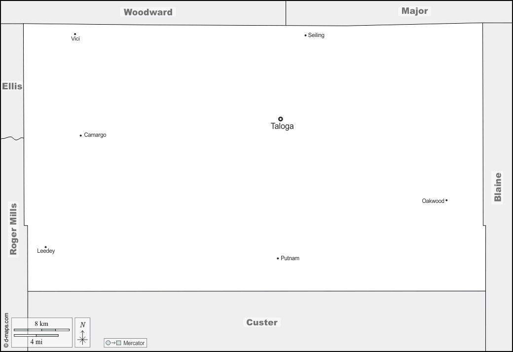 d-maps > संयुक्त राज्य > ओकलाहोमा > डेवी काउंटी > सीमाओं, मुख्य शहरों, नाम