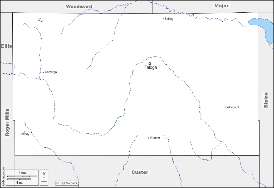 d-maps > संयुक्त राज्य > ओकलाहोमा > डेवी काउंटी > सीमाओं, जल-सर्वेक्षण, मुख्य शहरों, नाम