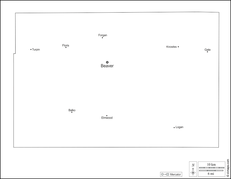 d-maps > संयुक्त राज्य > ओकलाहोमा > बेवर काउंटी > बाह्यरेखा, मुख्य शहरों, नाम, सफेद