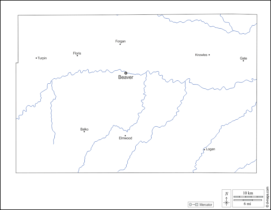 d-maps > संयुक्त राज्य > ओकलाहोमा > बेवर काउंटी > बाह्यरेखा, जल-सर्वेक्षण, मुख्य शहरों, नाम, सफेद