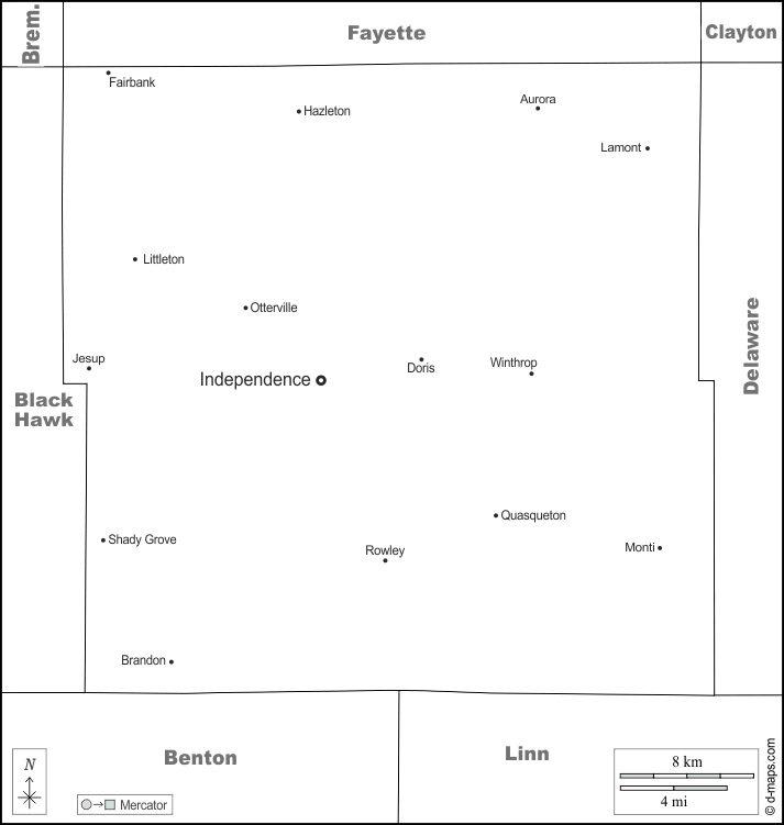 d-maps > संयुक्त राज्य > आयोवा > बुकानन काउंटी > सीमाओं, मुख्य शहरों, नाम, सफेद
