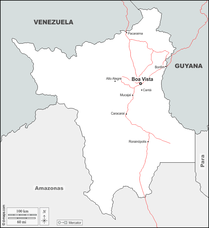 d-maps > महाअमेरिका > ब्राज़ील > रोराइमा राज्य > सीमाओं, मुख्य शहरों, सड़कों, नाम