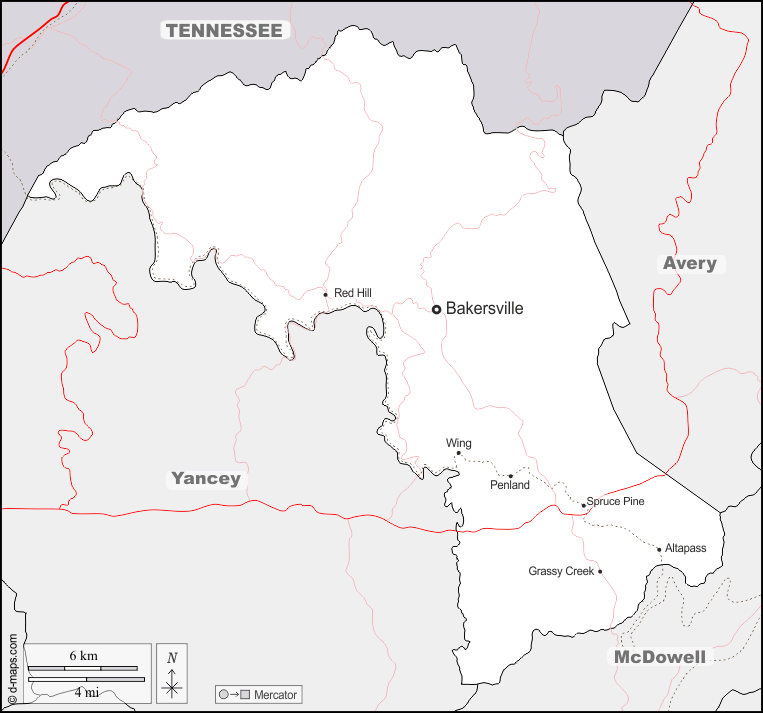 d-maps > संयुक्त राज्य > नॉर्थ कैरोलिना > मिशेल काउंटी > सीमाओं, मुख्य शहरों, सड़कों, नाम