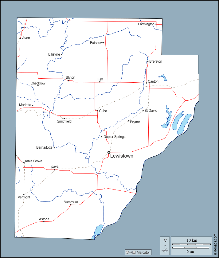 d-maps > संयुक्त राज्य > इलिनॉय > फुल्टन काउंटी > बाह्यरेखा, जल-सर्वेक्षण, मुख्य शहरों, सड़कों, नाम
