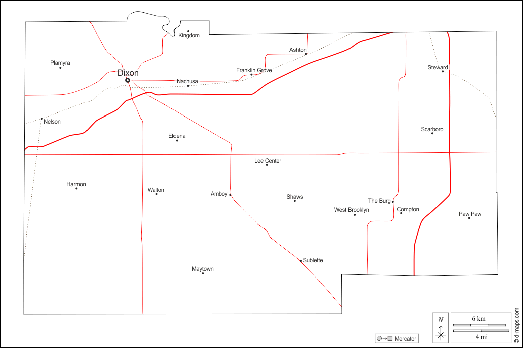 d-maps > संयुक्त राज्य > इलिनॉय > ली काउंटी > बाह्यरेखा, मुख्य शहरों, सड़कों, नाम, सफेद