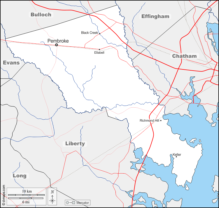 d-maps > संयुक्त राज्य > जॉर्जिया > ब्रायन काउंटी > सीमाओं, जल-सर्वेक्षण, मुख्य शहरों, सड़कों, नाम