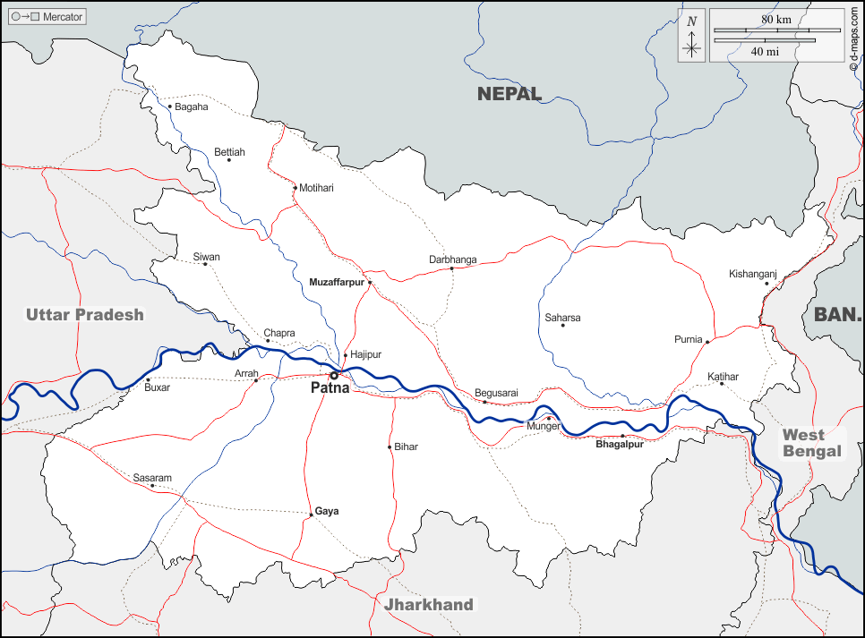 d-maps > एशिया > भारत > बिहार > सीमाओं, जल-सर्वेक्षण, मुख्य शहरों, सड़कों, नाम