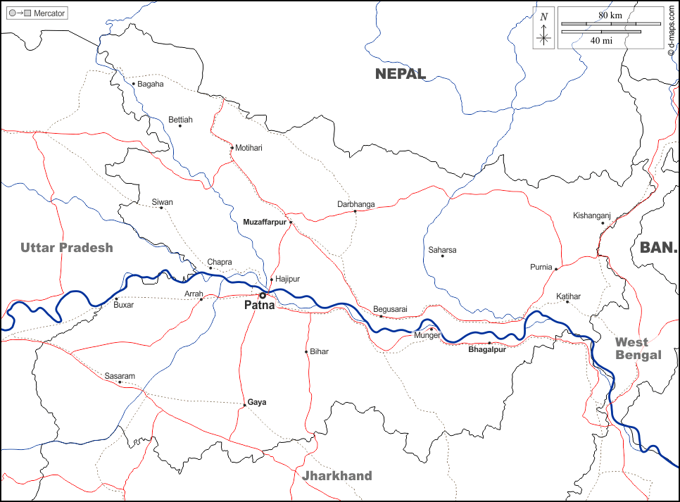 d-maps > एशिया > भारत > बिहार > सीमाओं, जल-सर्वेक्षण, मुख्य शहरों, सड़कों, नाम, सफेद