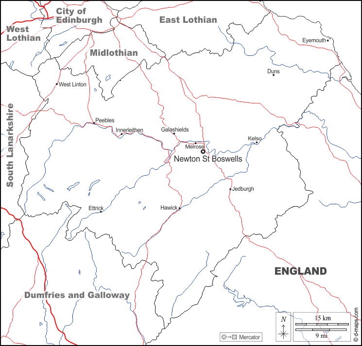 d-maps > यूरोप > युनाइटेड किंगडम > स्कॉटिश बॉर्डर्स > सीमाओं, जल-सर्वेक्षण, मुख्य शहरों, सड़कों, नाम, सफेद