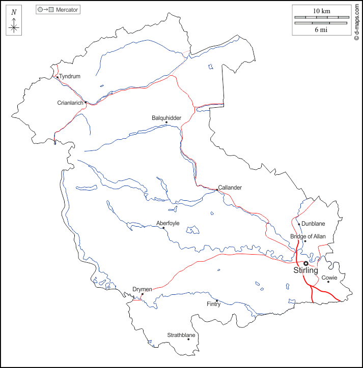 d-maps > यूरोप > युनाइटेड किंगडम > स्टर्लिंग > बाह्यरेखा, जल-सर्वेक्षण, मुख्य शहरों, सड़कों, नाम, सफेद