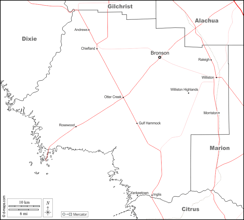 d-maps > संयुक्त राज्य > फ्लोरिडा > लेवी काउंटी > सीमाओं, मुख्य शहरों, सड़कों, नाम, सफेद