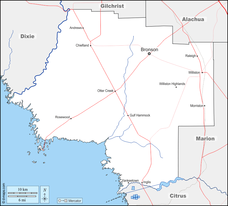 d-maps > संयुक्त राज्य > फ्लोरिडा > लेवी काउंटी > सीमाओं, जल-सर्वेक्षण, मुख्य शहरों, सड़कों, नाम
