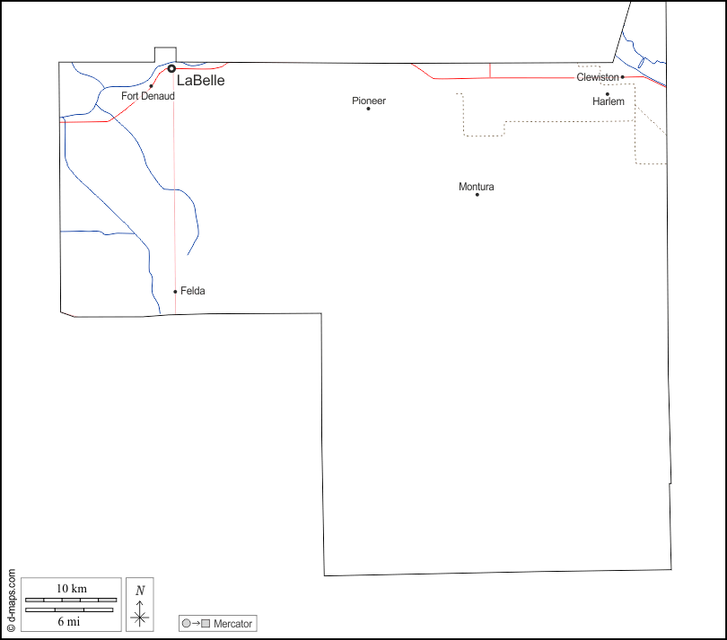 d-maps > संयुक्त राज्य > फ्लोरिडा > हेन्डी काउंटी > बाह्यरेखा, जल-सर्वेक्षण, मुख्य शहरों, सड़कों, नाम, सफेद