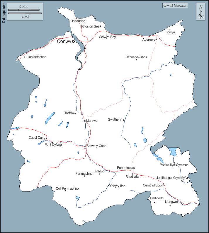 d-maps > यूरोप > युनाइटेड किंगडम > कनवी > बाह्यरेखा, जल-सर्वेक्षण, मुख्य शहरों, सड़कों, नाम