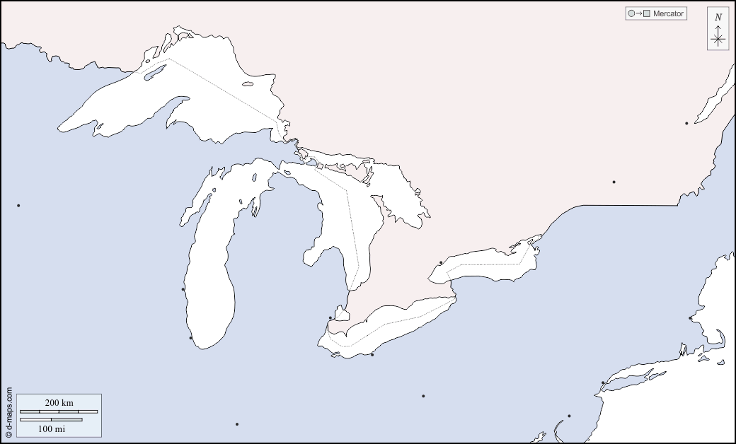 d-maps > महाअमेरिका > विशाल झीलें > राज्यों, मुख्य शहरों, रंग, सफेद